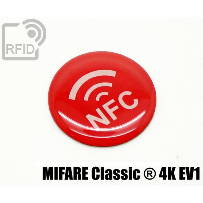 Circular adhesive label with 30 mm diameter with logo and print protection personalizes with transparent soft epoxy resin. Fully customizable with offset printing, numbering and QR Code and barcodes. Use in industrial environment, blockchain and advertising gadgets. Mifare Classic ® 4K Ev1 RFID chip S70 read and write HF 13,56 MHz ISO 14443A memory 4Kbyte 4 bytes tag ID 32 sectors x64b 8 sectors x256b original NXP.