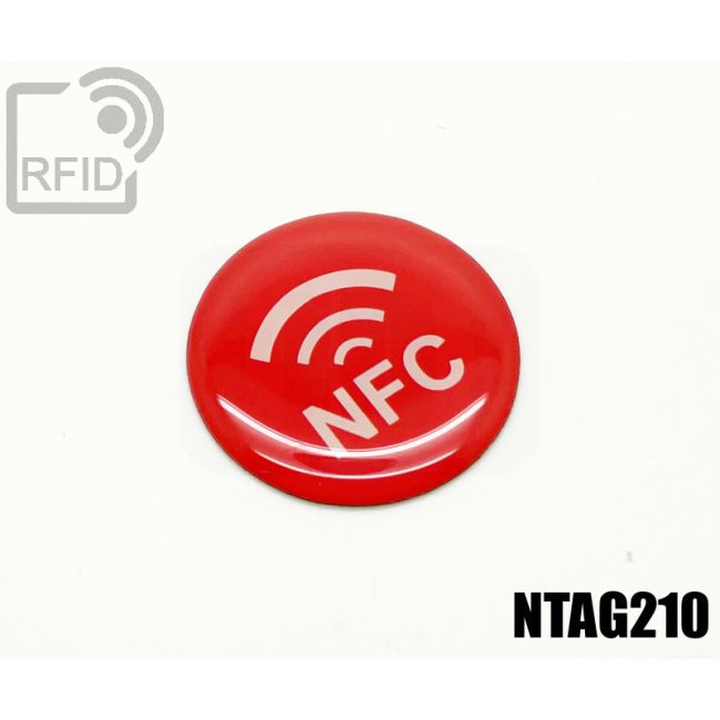 Circular adhesive label with 25 mm diameter with logo and print protection personalizes by soft transparent epoxy resin. Fully customizable with offset printing, numbering and QR Code and barcodes. Use in industrial environment, blockchain and advertising gadgets. NFC ntag210 RFID chip read and write HF 13,56 MHz ISO 14443A / NFC Type 2 memory 48 bytes / 12 blocchi x 4 Bytes / 7 Bytes tag ID original NXP.