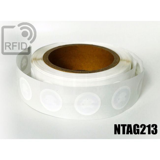 Etichetta RFID adesiva circolare per identificazione oggetti. Completamente personalizzabile fronte e retro con stampa in offset anche sul lato adesivo, numerazioni e barcode. Utilizzo in ambiente industriale e nei sistemi logistici. NFC ntag213 chip RFID lettura e scrittura (Read/Write) HF 13,56 MHz ISO 14443A / NFC Type 2 memoria 144 bytes / 36 blocchi x 4 Bytes / 7 Bytes tag ID originale NXP.