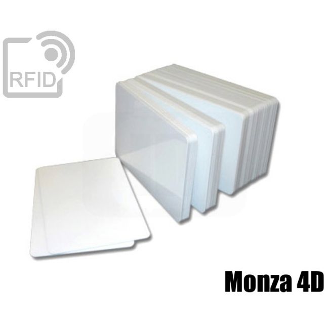 Tessere neutre laminate in PVC bianco formato standard ISO 7810 ID-1 con dimensione di 85,60 × 53,98 millimetri (3,370 × 2,125 in) e angoli arrotondati con un raggio di 2,88-3,48 mm. Utilizzate in origine per le carte bancarie oggi è utilizzato in molti paesi anche per le patenti di guida e carte di identità e in molti settori commerciali per carte fedeltà, identificazione e biglietti da visita. Monza 4D chip RFID lettura e scrittura (Read/Write) UHF 868 MHz EPC Class1 Gen2. ISO 18000-6C memoria User 32 bits EPC 128 bits originale Impinj.